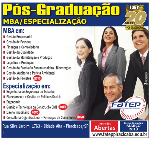A Divisão de Pós-Graduação da Fatep (Faculdade de Tecnologia de Piracicaba) começa 2013 com uma boa notícia: a ampliação de sua grade de cursos. A partir do primeiro semestre de 2013, quatro novas opções serão oferecidas, distribuídas entre as modalidades MBA e Especialização. As inscrições já estão abertas e podem ser feitas na Secretaria da Pós-Graduação da Fatep.