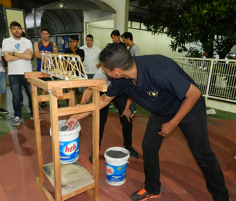 Com a orientação do professor Casagrande, os alunos desenvolveram uma geometria adequada, executando cálculos de esforços nas barras da treliça. A ideia era saber quantos quilos a ponte suportaria ao ser tracionada para baixo a partir de um ensaio destrutivo. Mas como o desafio também era conquistar nota para finalizar o semestre da disciplina, as apresentações tiveram até torcida, contra e a favor.